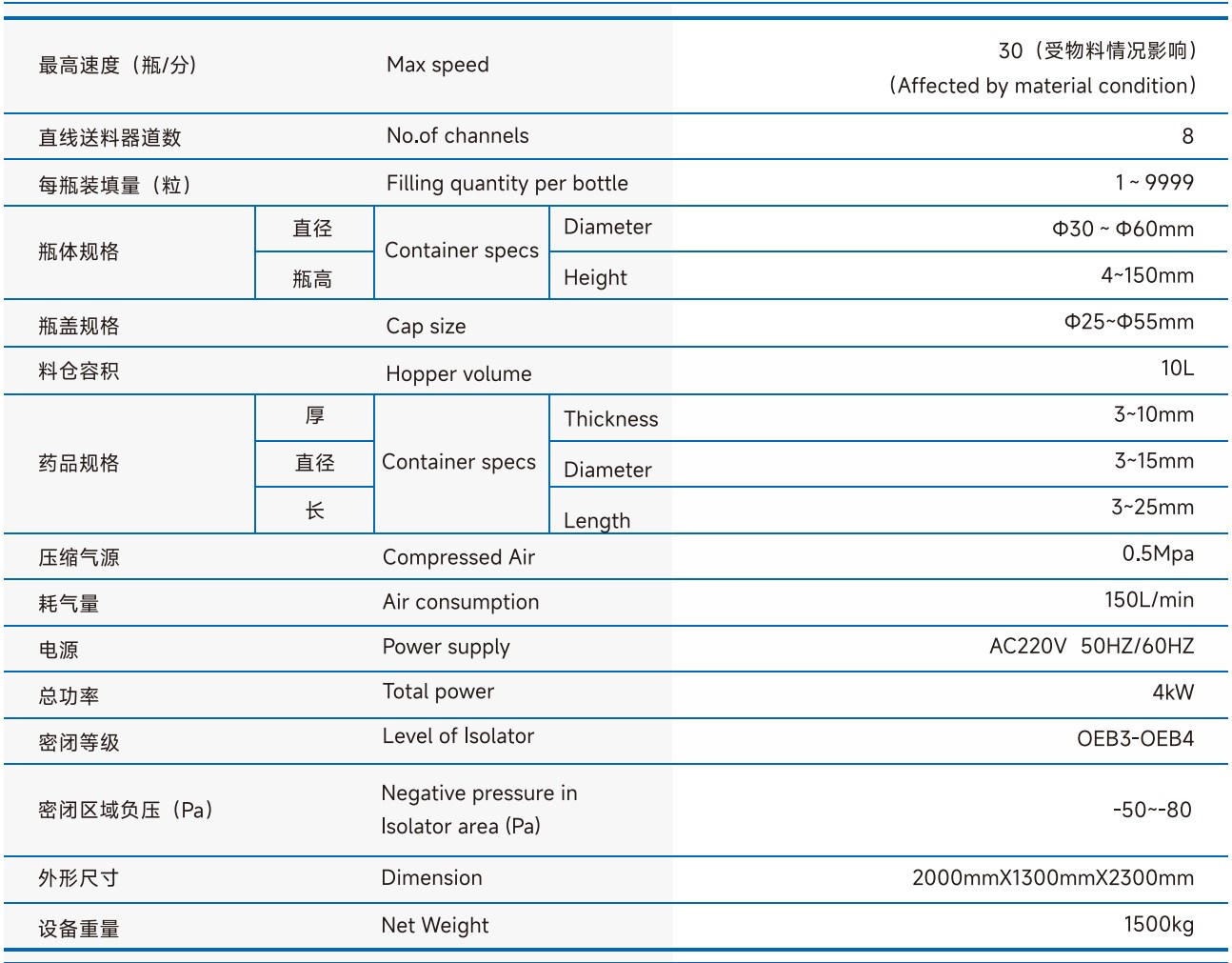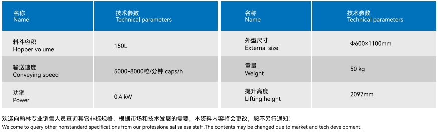 | 合用胶囊型号 | 最大出产效力 | 电源目标 | 紧缩氛围 | 形状尺寸 | 产物分量 | 料斗容积 | 保送速率 | 电源 | 形状尺寸 | 分量 |